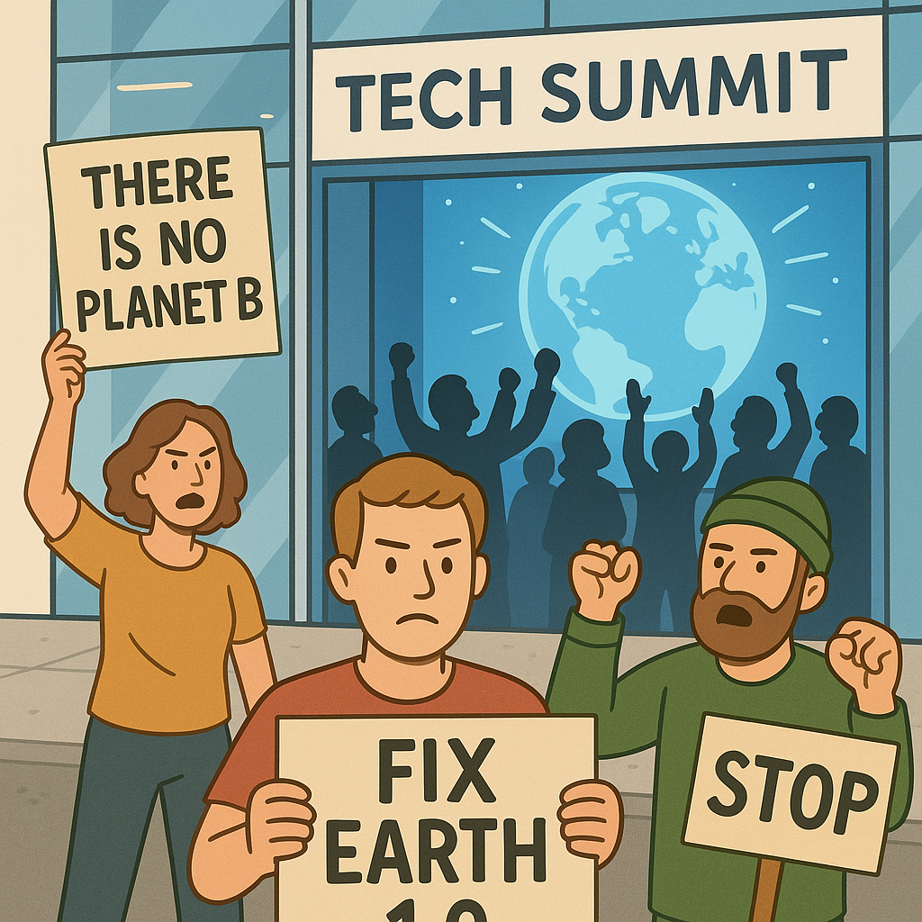 Outside the venue, a small group of protesters held signs reading “FIX EARTH 1.0” and “YOU CAN’T A/B TEST A BIOSPHERE.” Security carefully herded them into a designated demonstration zone located just off-camera, where their concerns could be safely acknowledged and structurally ignored.