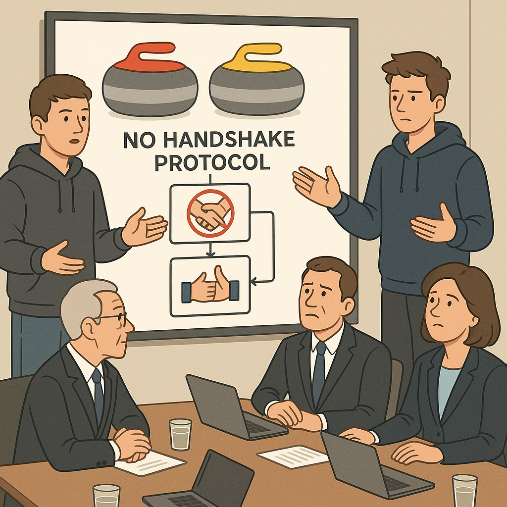 If the experiment succeeds, experts predict the No Handshake model will quickly spread from curling rinks to boardrooms, political summits, and family gatherings, where it will finally give everyone a socially acceptable reason not to touch that one uncle who still calls the internet “the Google.”