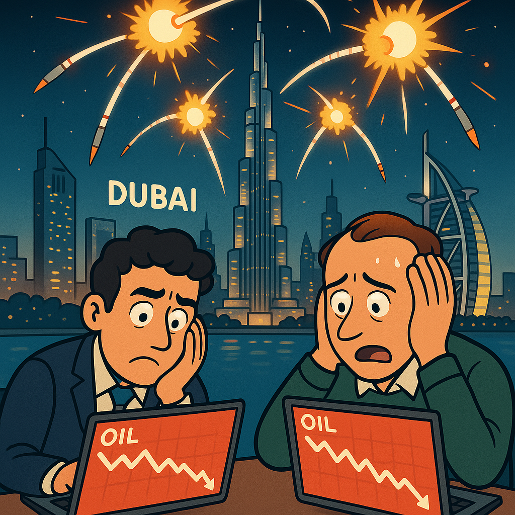 Out in Dubai, traders stare at their terminals as oil futures leap like a cat that just heard the can opener of destiny. The global markets treat every missile notification as a limited edition NFT: scarce, useless, and somehow still worth billions. Crude oil spikes, the UAE gets upgraded to “strategic flashpoint,” and analysts on business channels solemnly explain that “volatility may remain elevated” — a phrase that roughly translates to: “This is great for weapons stocks; bad for people without bunkers.”