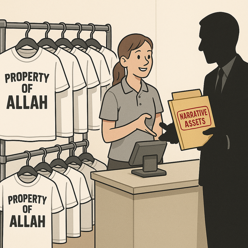 Meanwhile, on the home front, another carefully curated talking point drops into the news cycle: a new mass shooter photographed in a crisp, conveniently readable “Property of Allah” shirt — a logo designed like it came straight out of a Pentagon-branded Canva template. The ink wasn’t even dry on the crime scene tape before cable news anchors had their lower-thirds locked and loaded: “Islamist Radicals Strike Again,” with a quiet footnote reading, “Brought to you by our sponsor, Perpetual War, Inc.”