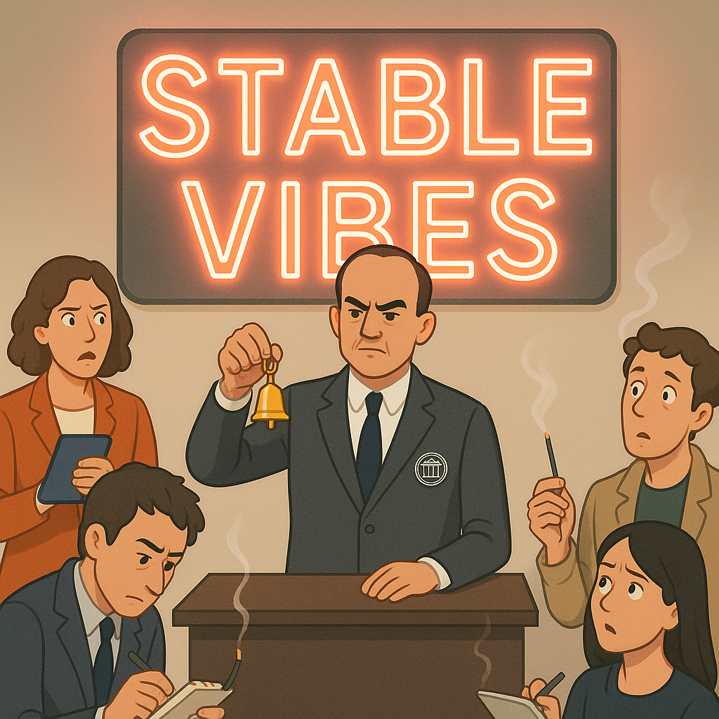 Defending the shift, Powell pointed to years of market reactions that appeared unmoored from fundamentals. “Look at 2021,” he said. “GameStop, Dogecoin, bored cartoon apes selling for more than starter homes. Then Sam Bankman-Fried happened, and the market still only half-flinched (NY Times). The data has been screaming this at us for a while: numbers are cosplay, vibes are policy.”