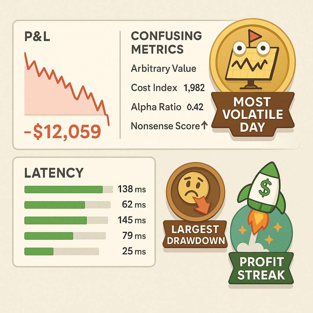 - Latency Monitor: A smug green bar that stays perfect while your strategy doesn’t.